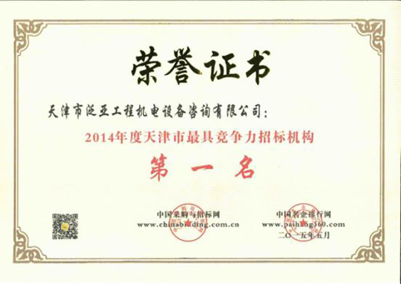 2014年度天津市最具競(jìng)爭(zhēng)力招標(biāo)機(jī)構(gòu)第一名